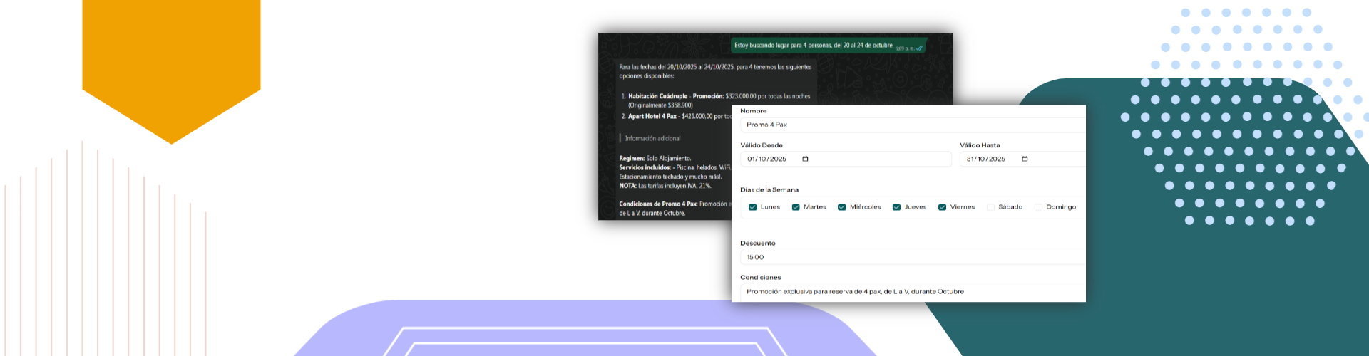 El agente detecta cuándo una consulta cumple los requisitos de una de tus promociones activas y la aplica automáticamente en la cotización, usando el descuento como un incentivo inmediato para cerrar la venta.
