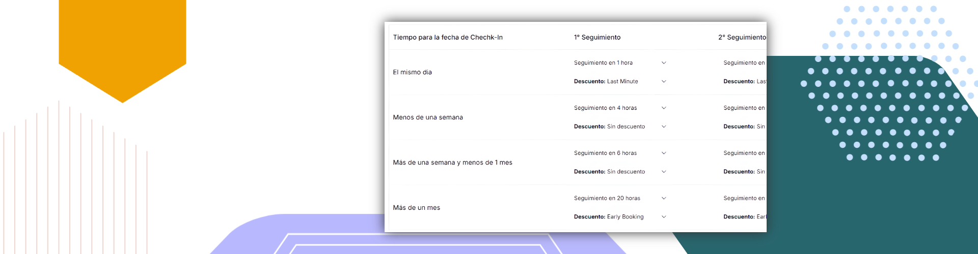 Configura seguimientos que se activan solos según la proximidad de la fecha consultada, pudiendo incluso asignarles descuentos para estrategias de “Last Minute” o “Early Booking”.
